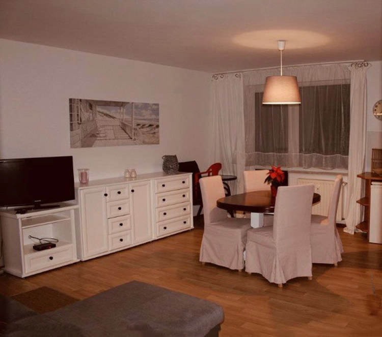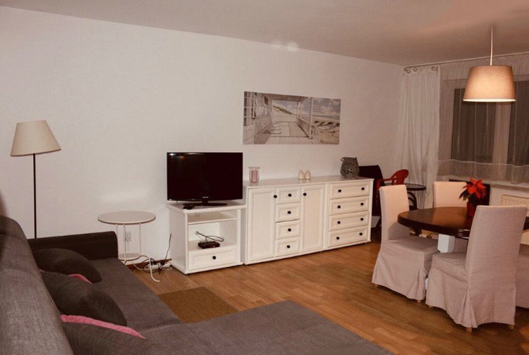 - duży pokój z aneksem kuchennym: wersalka dwuosobowa (kołdra, dwie poduszki), telewizor z płaskim ekranem (telewizja kablowa) , WIFI, stół + cztery krzesła, lampa stojąca,